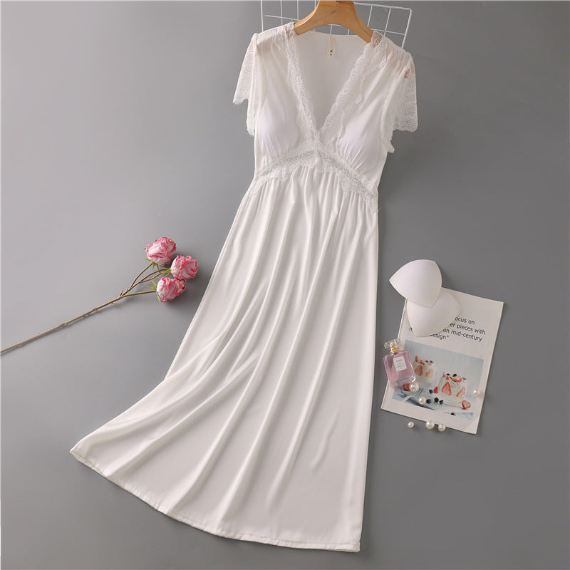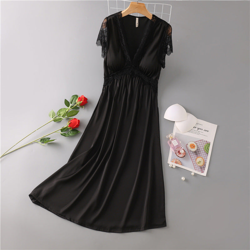 Nightdress Female Ice Silk Sexy Dress Mid-length Lace
